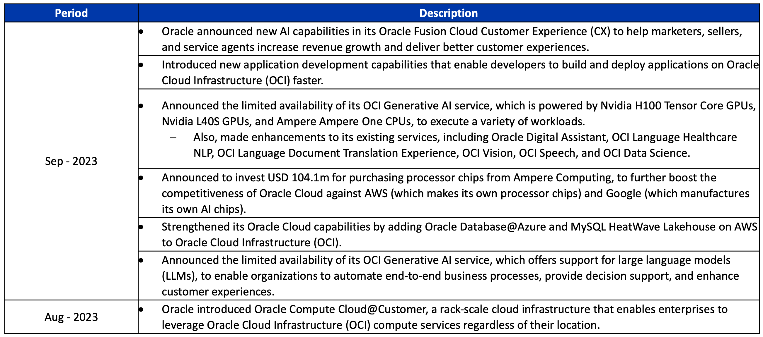 - Oracle Cloud indicated that AI development companies have signed contracts for purchasing USD 4.0 bn+ of capacity in its Oracle Gen2 Cloud, which is twice the booking value as compared to the previous quarter.