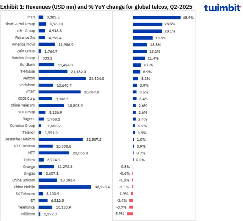 The 30 telcos achieved a combined revenue of USD 339.1 bn (YoY net new revenues of USD 11.5 bn) in Q2-2025. Only 8 of the 30 telcos analysed had a declining YoY quarterly revenue.