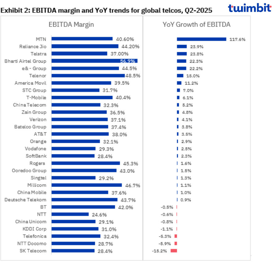 Average EBITDA margin for global telcos stabilized at 36.1% in Q2-2025.