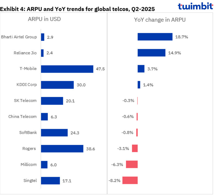In Q2-2025, Jio, Airtel, and America Movil lifted ARPU through tariff hikes and postpaid growth, while Rogers, Softbank, Singtel, and Millicom faced declines in saturated markets. SK Telecom and China Telecom held ARPU steady, showing resilience amid churn and tariff pressures.