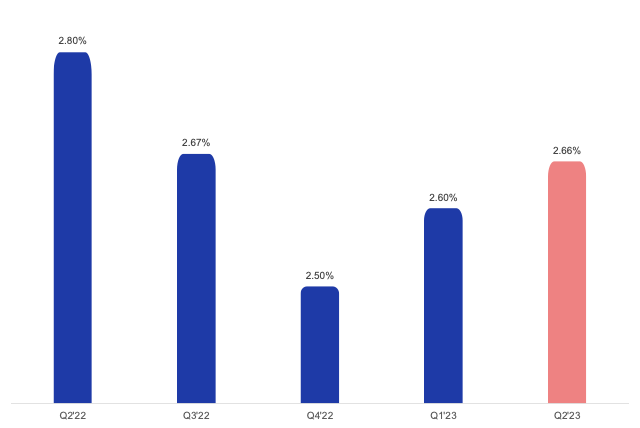 Furthermore, the integration added USD 25 million to the bank’s operating expenses and accounted for 12% of these expenses. The bank’s cost efficiency also remained unchanged between Q2 2022 and Q2 2023 at 56% when adjusting for these one-off expenses.