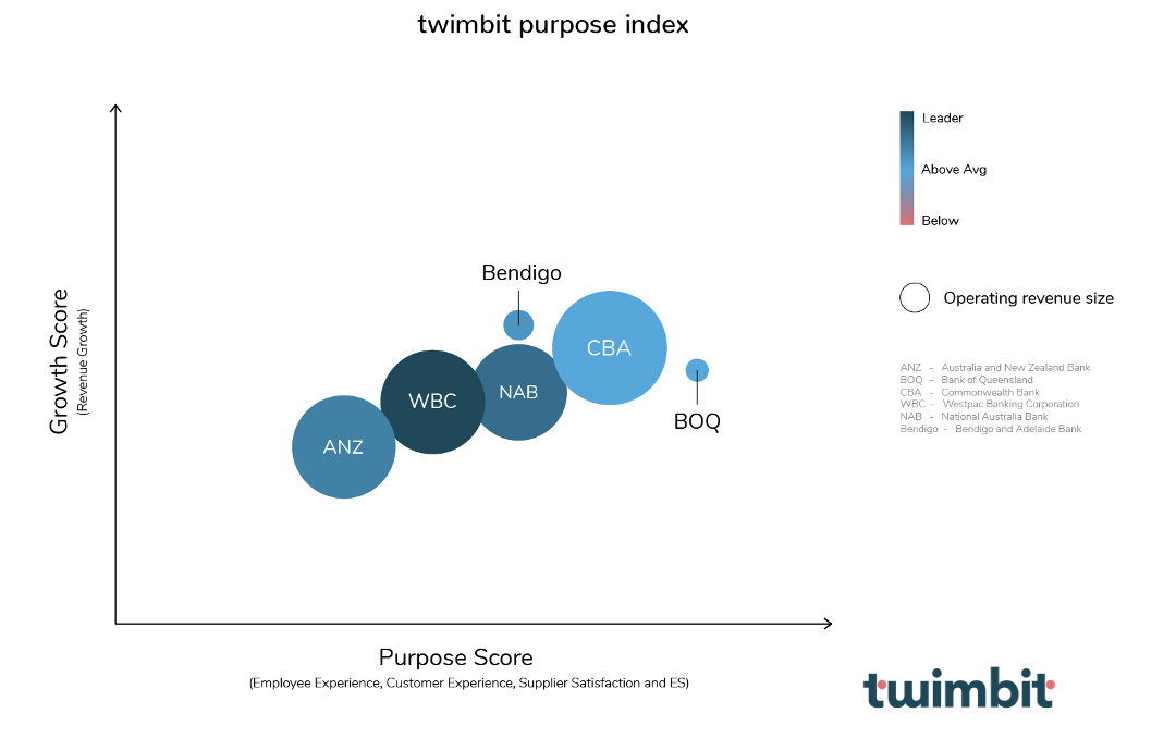 We analysed the top 6 Australian banks on the twimbit Purpose Index (Figure 1). For this report, we deep-dived into the big 4 Australian banks. Our analysis includes growth opportunities across five key areas that the banks need to focus on for future success.