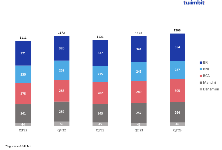 BCA reported the highest growth at 10.95% YoY, from USD 275 million in Q3 2022 to USD 305 million in Q3 2023. BRI reported the second-highest growth at 10.13%, from USD 321 million to USD 354 million.